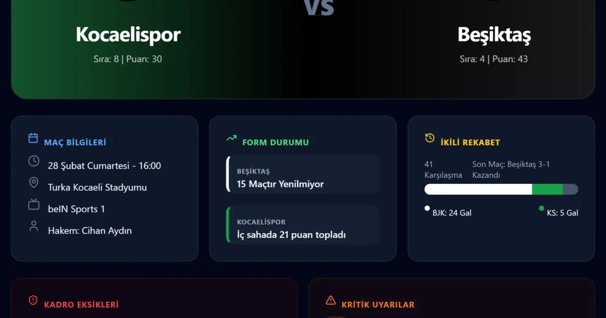 ⚽ Kocaelispor – Beşiktaş maçı öncesi tüm detaylar: Muhtemel 11’ler, istatistikler ve kritik notlar