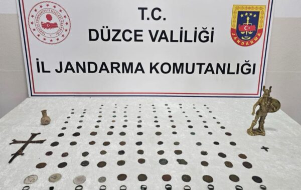 Düzce'nin Gölyaka ilçesinde 136 tarihi eserle yakalanan 2 şüpheli gözaltına alındı.